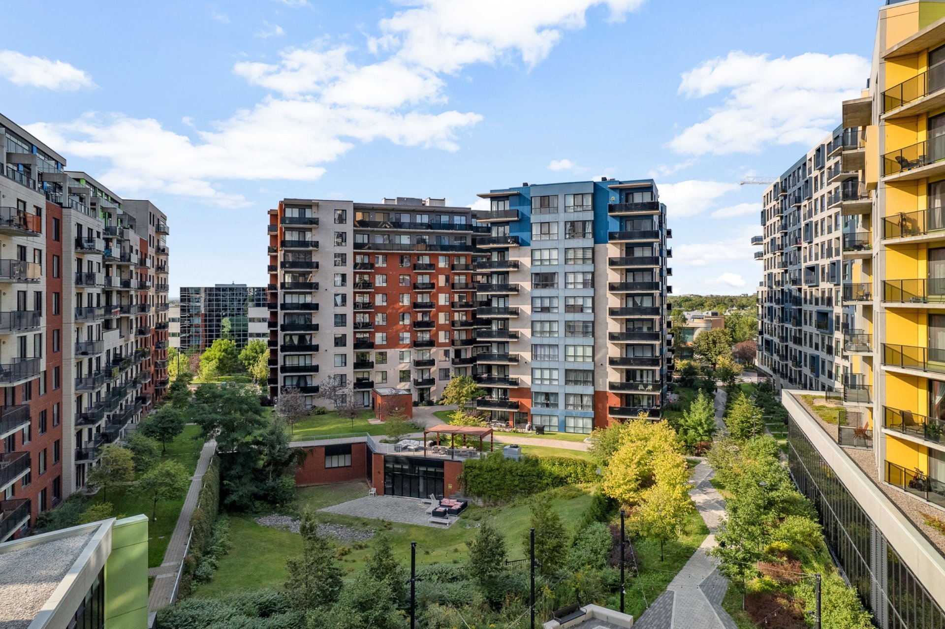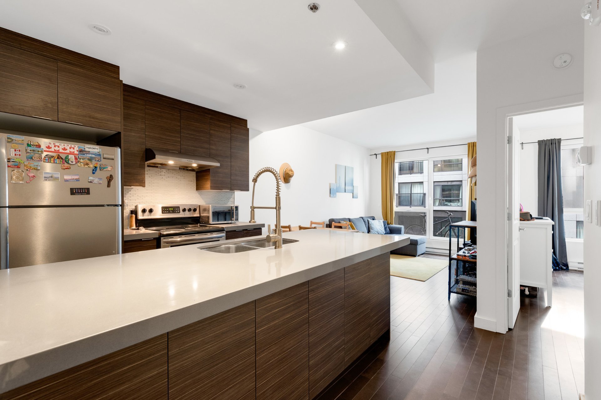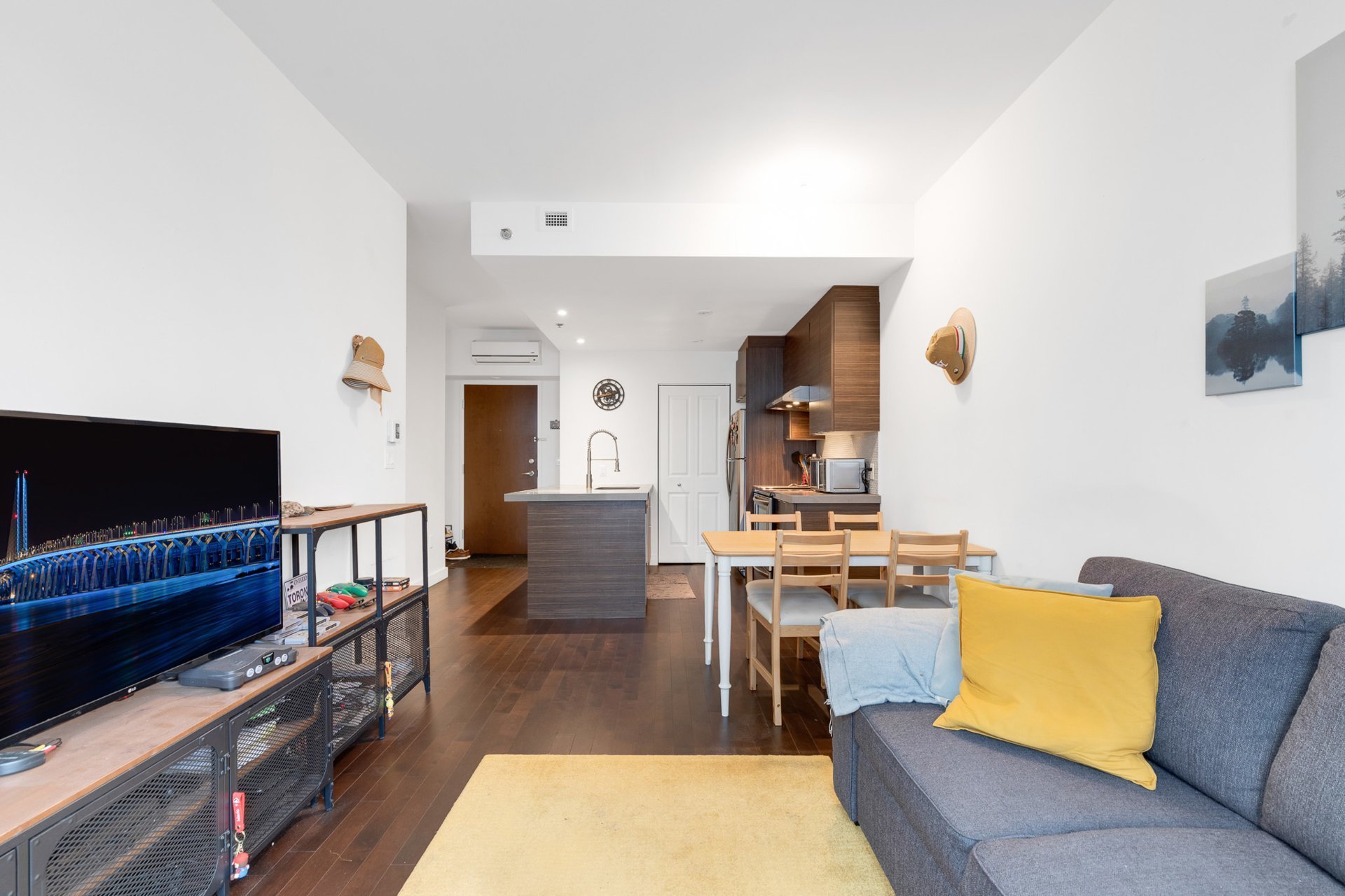 Bright 3rd-floor 1-bedroom condo with open-concept layout, hardwood floors, and quartz countertops. Includes fridge, stove, microwave, washer/dryer, wall-mounted AC, and curtains. Prime location--just 5 minutes to Namur & De la Savane metro, with easy access to HWY 15/40 and all amenities. Enjoy Club VUE facilities: gym, indoor pool, cinema, lounge, spa, and landscaped terrace. Perfect for professionals or investors!