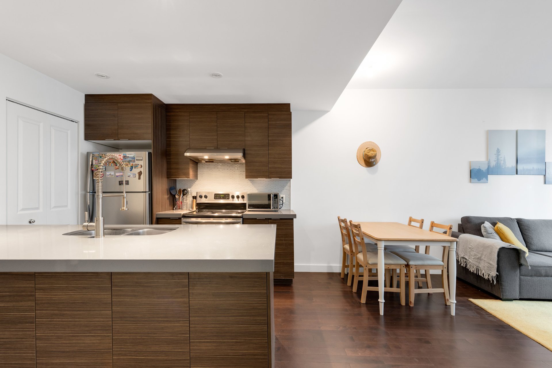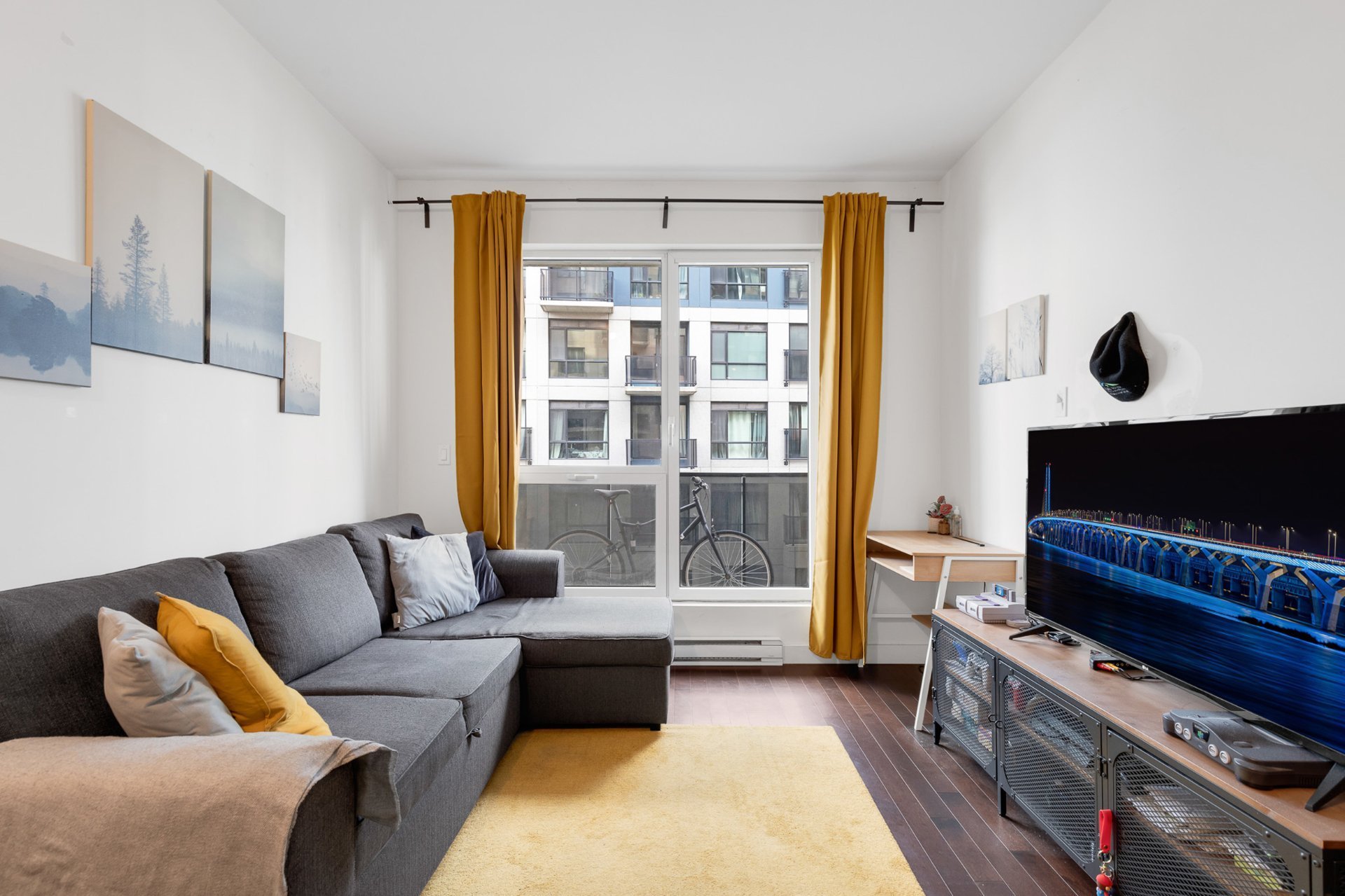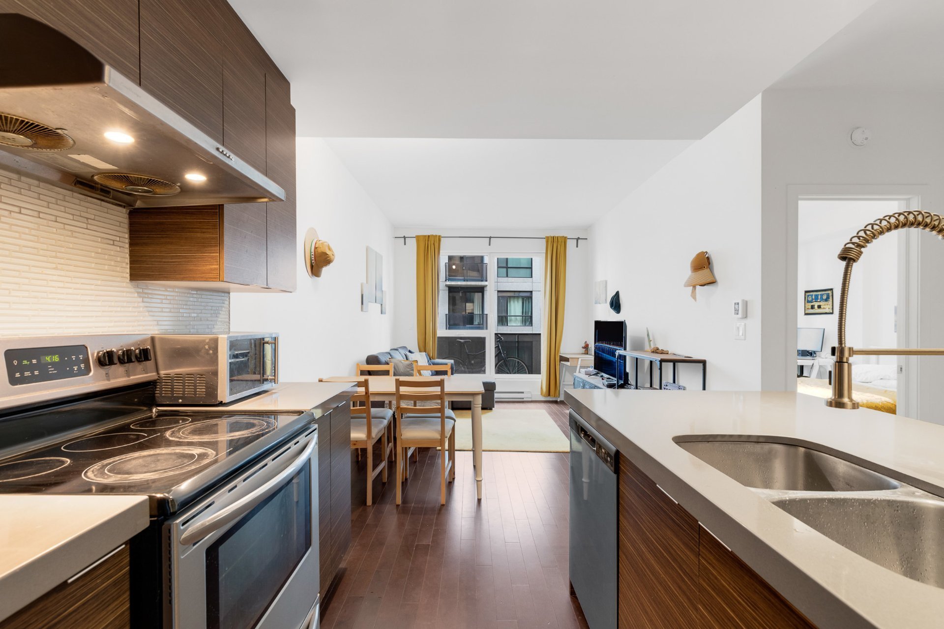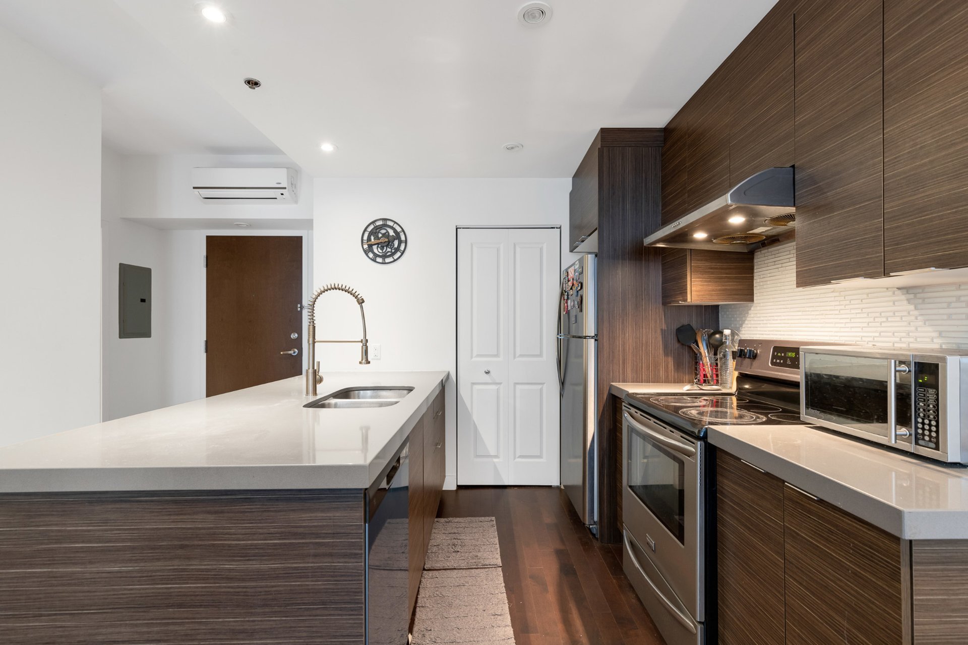 Bright 3rd-floor 1-bedroom condo with open-concept layout, hardwood floors, and quartz countertops. Includes fridge, stove, microwave, washer/dryer, wall-mounted AC, and curtains. Prime location--just 5 minutes to Namur & De la Savane metro, with easy access to HWY 15/40 and all amenities. Enjoy Club VUE facilities: gym, indoor pool, cinema, lounge, spa, and landscaped terrace. Perfect for professionals or investors!